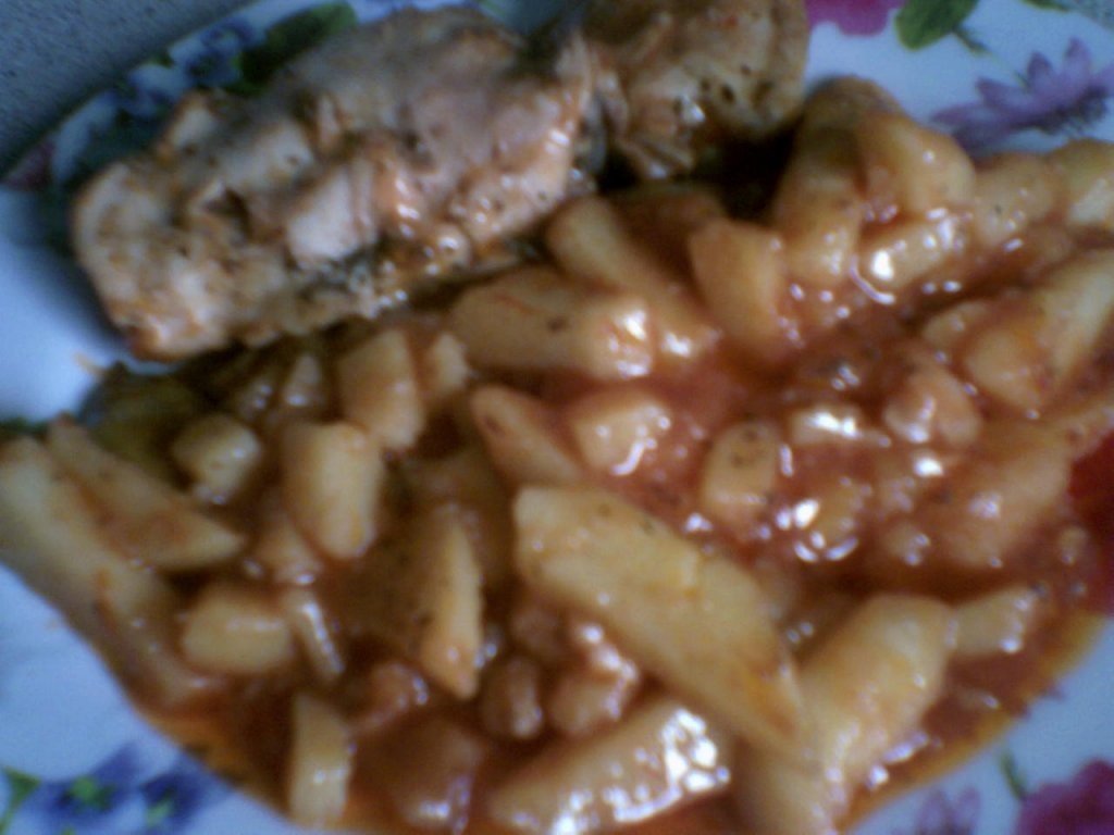 Spalam, curatam pulpele de pielita si le taiem in doua,le asezam in tava,apoi punem pe langa ele cartofii curatati si taiati,punem o cana de apa(cine vrea mai mult sos pune mai multa apa)si dam tava la cuptor pentru 50 de minute,dupa care punem usturoiul pisat,bulion,boia,sare si piper si mai lasam la cuptor 10 minute.