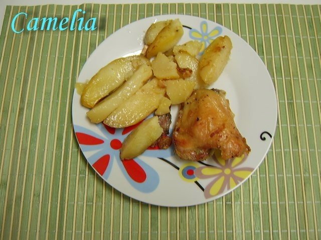 Se spala pulpele si se sterg cu servet de hartie. Se pun intr-o tava in care s-a pus ulei. Cartofii se curata de coaja si se taie in felii mari. Se presara sare si piper proaspat macinat. Daca este nevoie se mai pune ulei. Se amesteca toate bine si se introduc in cuptorul incins. Cand este aproape gata se pune usturoiul taiat feliute si se amesteca. Se introduce din nou in cuptor pana se rumeneste.