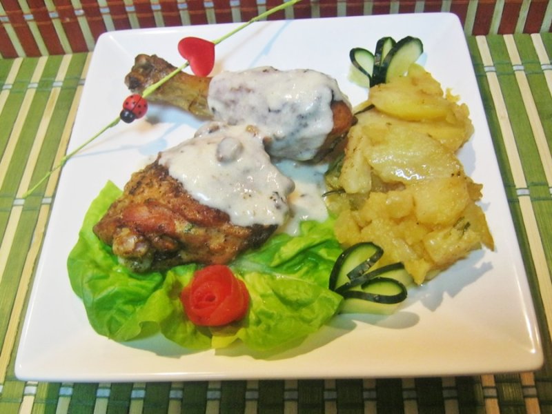 Asezam deasupra lor pulpele de pui coapte, patrunjel verde tocat si dam la cuptor sa se rumeneasca cam 20-30 de minute pina sunt gata si cartofii.