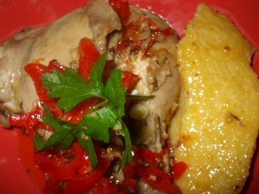 Asezati pe farfurii friptura cu sos din cratita si o lingura de mamaliguta langa ea. Garnisiti cu frunze de patrunjel verde si bucatele de morcov si ardei rosu.
