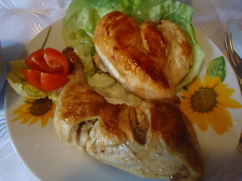 Trecem carnea prin sosul obtinut din ulei, zeama de lamaie,sare,piper,apoi asezam in dubletta incinsa. Lasam sa se rumeneasca pe ambele parti si sa se patrunda.Peste pieptul de pasare stropim cu sosul ramas(ulei si zeama de lamaie)