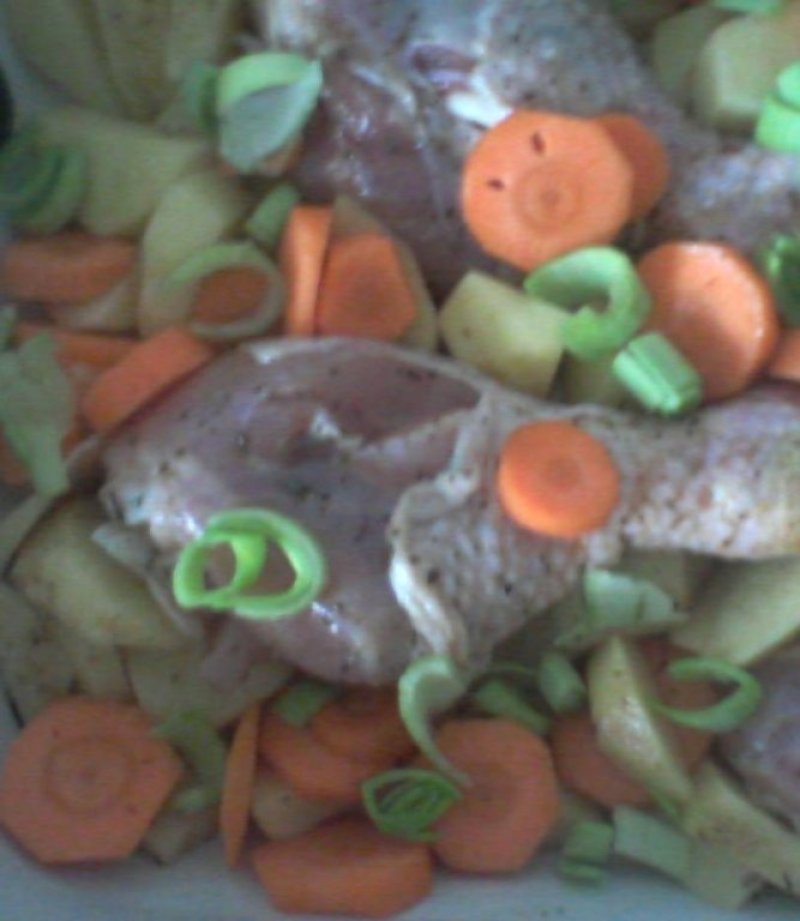 In tava punem pulpele de pui, cartofii , morcovii si prazul. Punem sare si piper si dam la cuptor pana cand carnea e facuta.