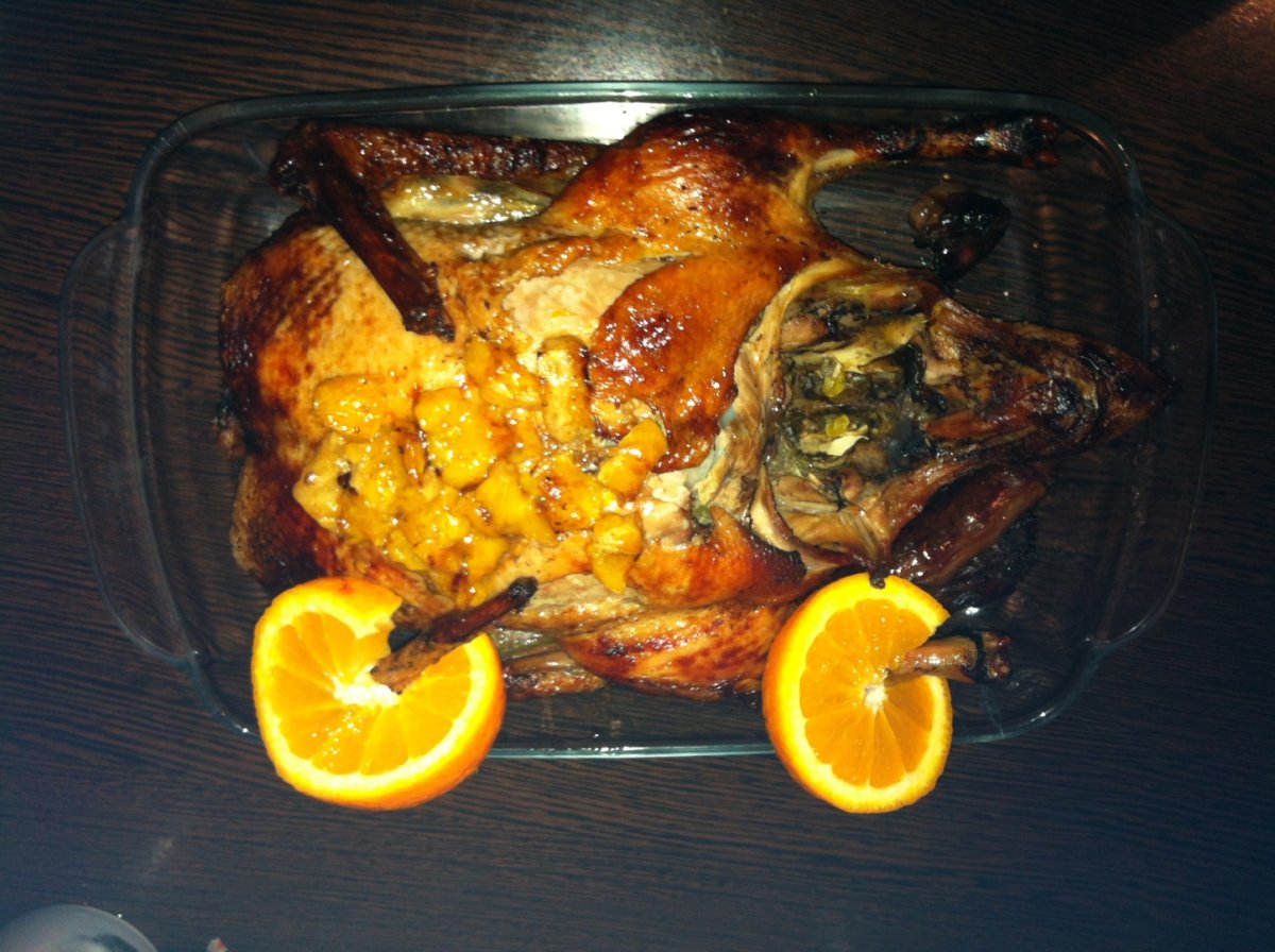 Separat, cureti o portocala de coaja, o tai felii sau bucati cat mai mici si o asezi in tava. Din cand in cand ungi rata cu zeama din tava. Cu 15 minute inainte de a scoate friptura, o stropesti cu vermut.