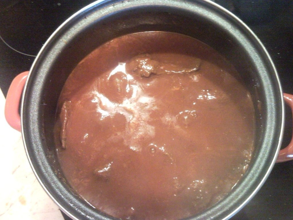 - am pus bucatile de carne impreuna cu doua lingurite de ulei si vinul alb, la fiert, intr-o cratita mai adanca. Am lasat carnea pe foc, cam 3 ore.(cred ca am nimerit un "vitelus"cam batran :)) )