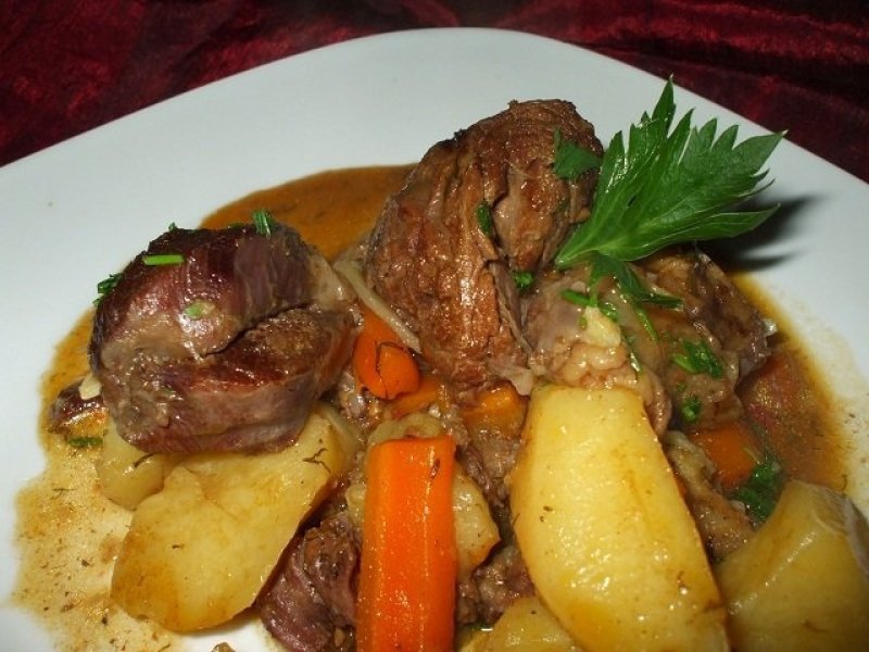Puneti intr-o cratita untul la topit, adaugati uleiul de masline si apoi bucatile de carne. Amestecati pana isi schimba culoarea. Presaraţi faina peste carne, adaugati morcovii si bacon-ul. Amestecati 2 minute. Puneti cepele taiate in jumatate, rosiile feliate, vinul si apa clocotita cat sa acopere carnea.