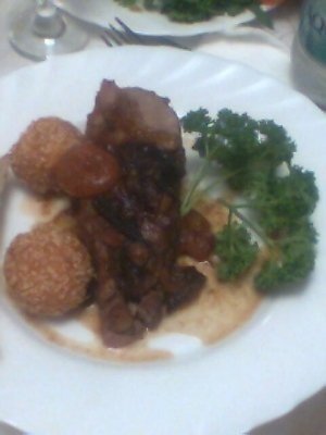 Sos: mustarul se amesteca ulei, condimente. Carnea,snuruita se trece prin sos si se rumeneste in ulei incins. Se asaza in tava, se condimenteaza se presara cu ceapa, usturoi, adaugi o ceasca de apa si se da la cuptor.Intorci din cand in cand. Spre sfarsit, adaugi vinul, lasi sa scada sosul.Dupa ce se raceste, indepartezi sfoara,tai felii. Incalzesti in sosul propriu, strecurat. Servesti cu salata verde sau sote de ciuperci,sau cu garnitura de crochete din cartofi.