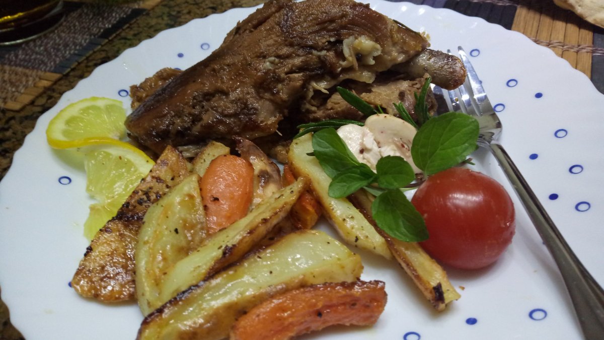 Punem carnea in tava, peste care vom pune, crengutele de cimbru, busuioc, rozmarin si oregano. In tava vom pune supa de miel, eventual orice supa aveti la indemana, foile de dafin si apoi vom acoperi cu o folie de aluminiu si vom da tava la cuptor, timp de 3- 4 ore, pana cand carnea e frageda si se desprinde usor de pe os. Dupa o ora si jumatate vom scoate folia, vom unge cu sucul lasat de friptura in tava si vom da din nou tava la cuptor, dar fara sa mai acoperim cu folie pentru ca friptura noastra sa prinda o crusta crocanta. La fiecare jumatatede ora vom scoate tava si vom unge friptura cu sucul din tava, iar cand a scazut aproape tot sucul vom stropi cu otet sau vin si mai lasam 15 minute. Dupa ce s-a gatit carnea, vom scoate tava din cuptor, o vom acoperi cu folia de aluminiu, o vom lasa sub aburi 15 minute, dupa care o putem savura alaturi de garnitura cu legumele pregatite si o salata de rucola cu ciperci champignon si rosii cherry. Am obtinut o friptura foarte aromata, aspectoasa, frageda si suculenta, asa cum era de asteptat.