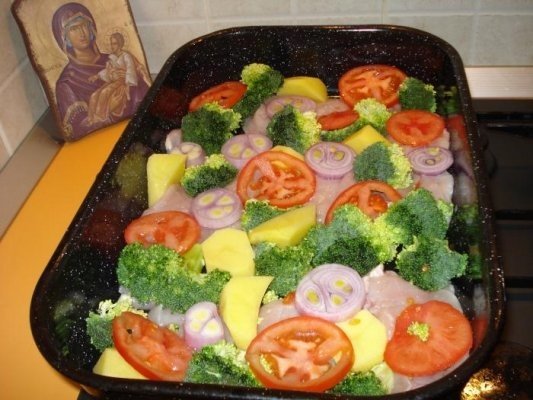 Se aseaza toate intr-o tava cu putin ulei, apa si condimente pentru pui si se da la cuptor. Pofta buna!!