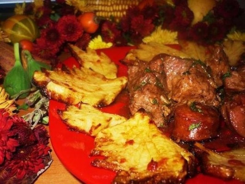 Se incinge cuptorul. Se taie carnea de porc bucati maricele si se pune in punga magica cu condimentele. Se amesteca bine. Se taie rondele carnatul sis e prajeste putin, nu de tot. Se adauga apoi si rondelele de carnat afumat in punga impreuna cu carnea de porc si 3 graunti de usturoi tocati rondele. Se lasa sa se patrunda bine. Se desface apoi punga si se adauga vinul si o lingura de ulei. Se lasa sa se rumeneasca fara sa mai inchidem punga.In alta tava asezam feliile de cartofi taiate in forma de frunze si date cu bulion, ulei si parmezan deasupra, iar cu grija turnam printre ele putina zeama de supa de carne. Se dau la cuptor pana se rumenesc. Se servesc pe un platou pe care asezam pe margini frunzele din cartofi rumenite si in mijloc friptura de porc cu carnati si vin. Pofta mare!