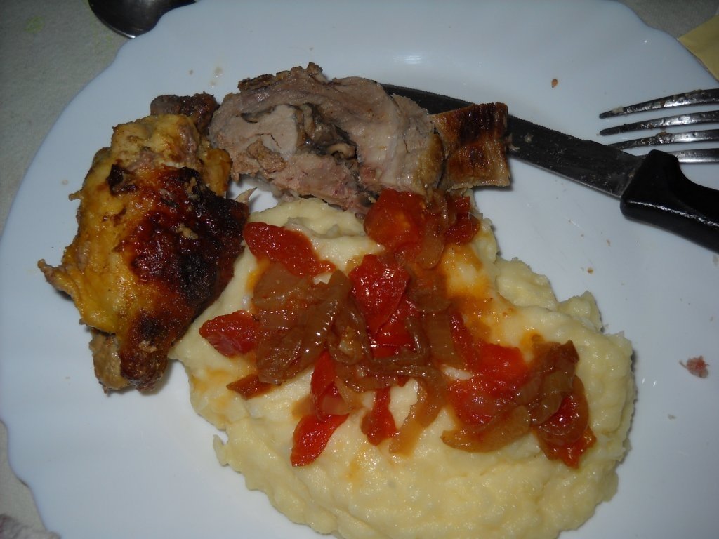 Lasati la cuptor 2 ore,serviti cu piure de cartofi si rondele de ardei rosu
