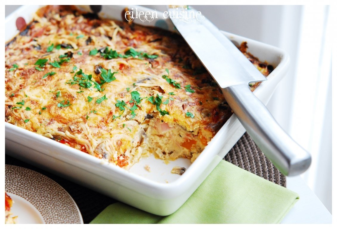 Se amesteca in compozitie ardeii cubulete, ciupercile (lasand cateva deoparte pentru ornat), porumbul, sunca, ardeiul iute, ketchup-ul sau rosiile din conserva.