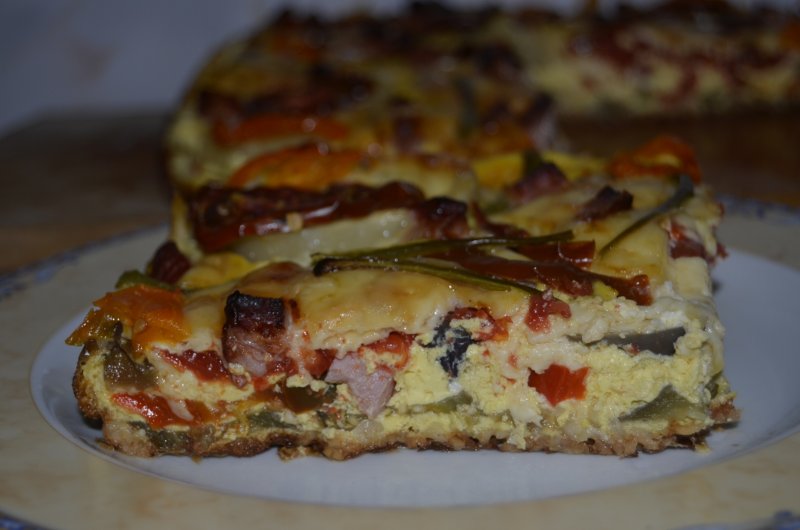 Se bat ouale cu smantana, putina sare si se toarna in tava, se rade cascavalul si se presara deasupra, apoi se orneaza cu rosii, ardei si se da tava la cuptor pentru circa 40 minute.