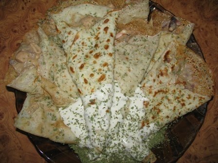 5. Se amestecul la cele 8 clatite.Clatitele se impacheteaza sub forma de conuri.Se aseaza clatitele umplute pe farfurie, se stropesc (otional) cu sos de maioneza cu usturoi si se servesc.
