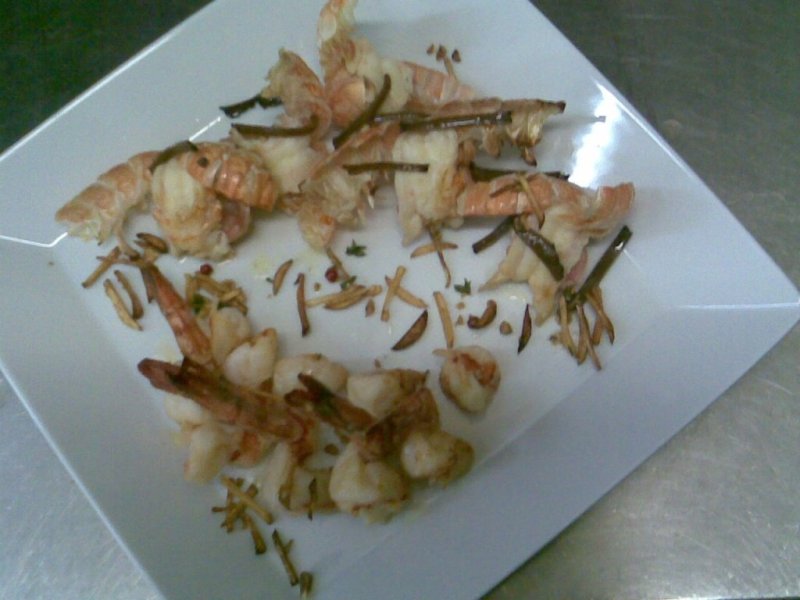 Proces tehnologic: se curata langustinele si crevetii dupa care crevetii ii vom taia in fluture, usturoiul il tocam julien iar 2-3 catei ii facem pasta,cimbrul si rozmarinul se toaca marunt, iar piperul rosu il zdrobim. Se pune o tigaie la incins cu unt si se soteaza creveti cu langustinele si usturoiul pasta,sare si piper si stingem cu putin vin dupa care acoperim cu capac 1 minut pentru a se inabusi. Separat vom sota usturoiul julien impreuna cu cimbru, rozmarin sare,piper zdrobit. Vom pune fructele de mare in farfurie, iar peste ele vom pune usturoiul sotatsi fisiile de trufe marinate sau proaspete.