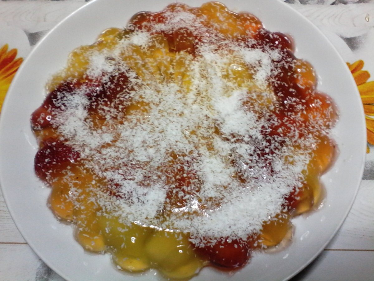 Fierbem apa. Adaugam gelatina granule si zaharul si amestecam bine pana se dilueaza. Luam de pe foc si adaugam suc de portocole/compot/alt suc si amestecam bine. Lasam sa se raceasca si punem in forma adaugam fructele taiate. Bagam la frigider pentru 3-4 ore. Scoatem din forma pe o farfurie si decoram cu nuca de cocos.