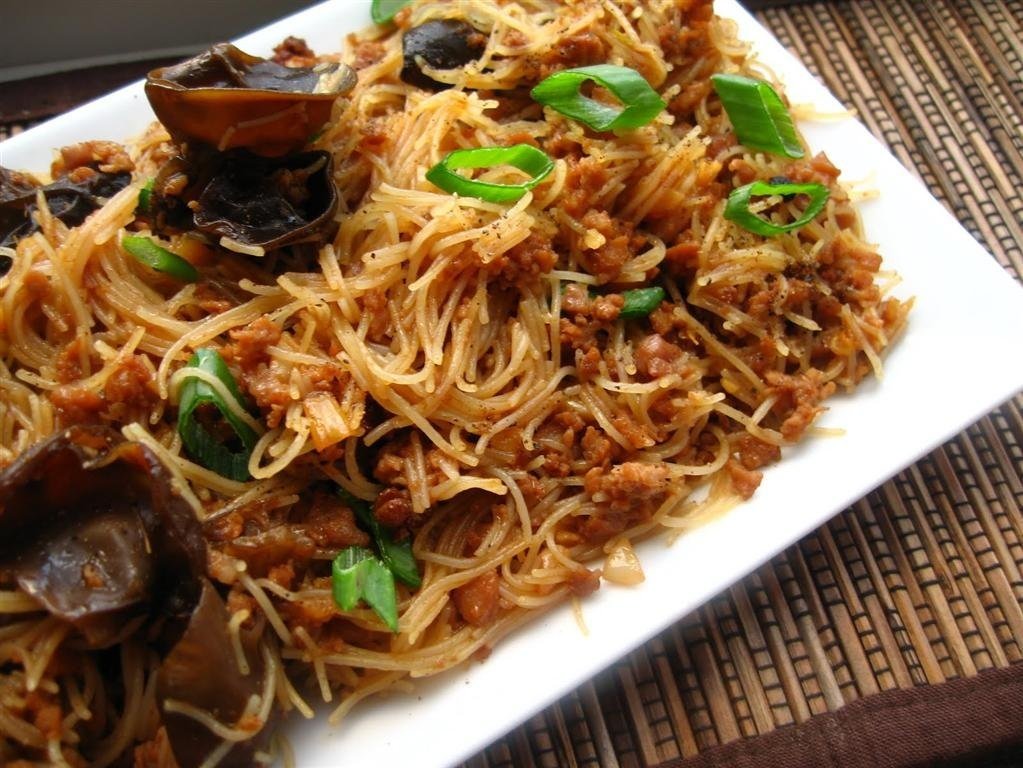 Taiem ciupercile shiitake hidratate si le adaugam la amestecul de carne, adaugam taiteii de orez scursi de apa, iar peste ei sosul de soia light si restul de ulei de ardei iute. Amestecam totul bine astfel incat bucatelele de carne sa fie imbinate cu taiteii, transferam pe un platou.