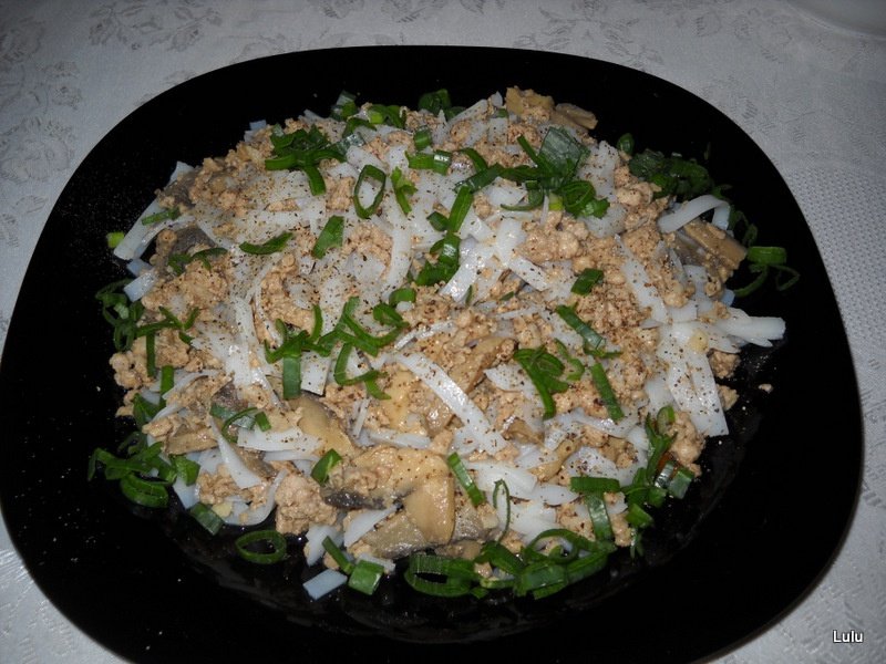 Dupa ce totul este rumenit si s-a evaporat apa lasata de carne si ciuperci, se adauga sosul de soia, de stridii, otetul de orez, pudra de ghimbir, sare daca e nevoie, se amesteca bine, iar dupa 1min. se da deoparte.