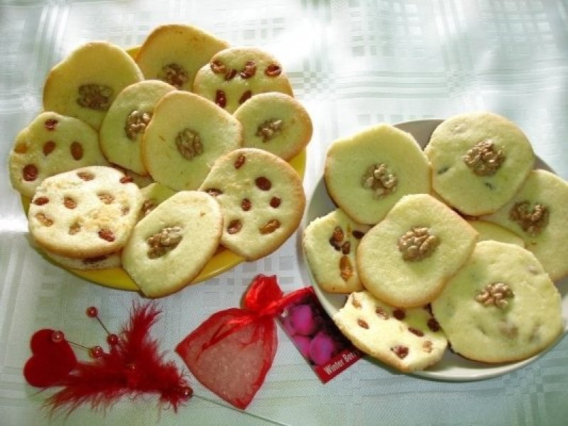 Se freaca oul cu zaharul , un praf de sare si praful de copt stins in zeama de lamaie pana se albeste. Se adauga uleiul cate putin si se freaca. La sfarsit se adauga faina cate putin. Se pun gramajoare in tava pe hartie de copt si se aseaza in mijloc nuci si stafide.
