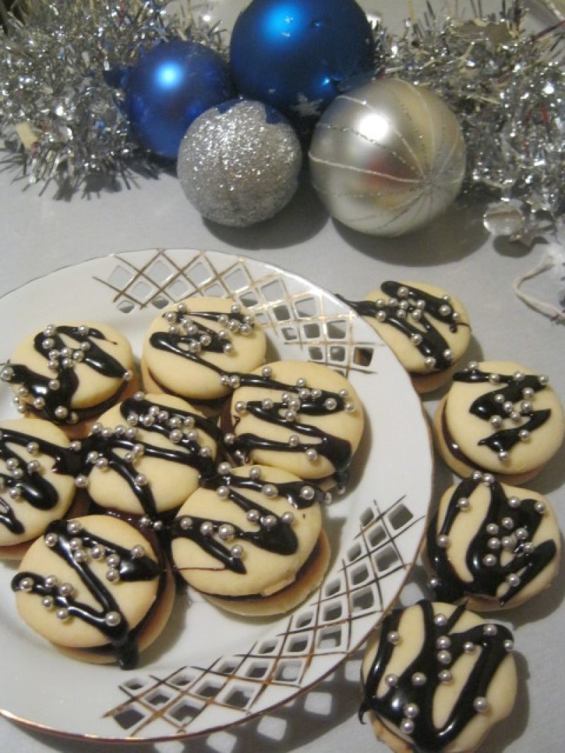 Am asamblat fursecurile punand crema intre 2 bucati si am ornat cu ciocolata topita si bombonele.