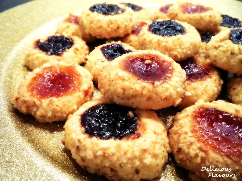Untul la temperatura camerei il mixam cu zaharul pana devine ca o spuma, adaugam smantana, galbenusul de ou, pudra de vanilie si continuam sa mixam la viteza mica pana la omogenizare. Incorporam treptat faina amestecata cu praful de copt, formam o bila si incepem sa rupem din ea cate putin. Formam bilute mici pe care le dam prin nucile tocate si le asezam in tava tapetata cu hartie de copt. In mijlocul fiecarei bilute formam o gaura (eu am folosit fiola de la pudra de vanilie, deoarece are fundul rotunjit :D, dar puteti folosi orice altceva usor rotund) si umplem cu gem (atentie la ce fel de gem folositi, trebuie sa fie foarte gros, altfel va curge in timpul coacerii...daca nu aveti de casa, va recomand gemurile Raureni).