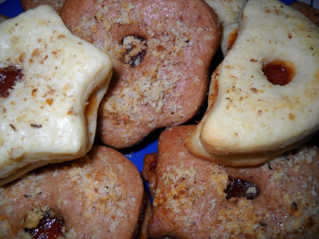 Se întinde aluatul în aşa fel încât să fie de aproximativ 5 mm grosime, după care se taie cu formele alese în perechi. Perechea fiecăruia se va găuri pe mijloc. Se aşează în tava unsă cu margarină, se unge cu albuşul de ouă bătut pe jumătate şi se presară cu nucă. Se pune la cuptor pentru aproximativ 10 minute.