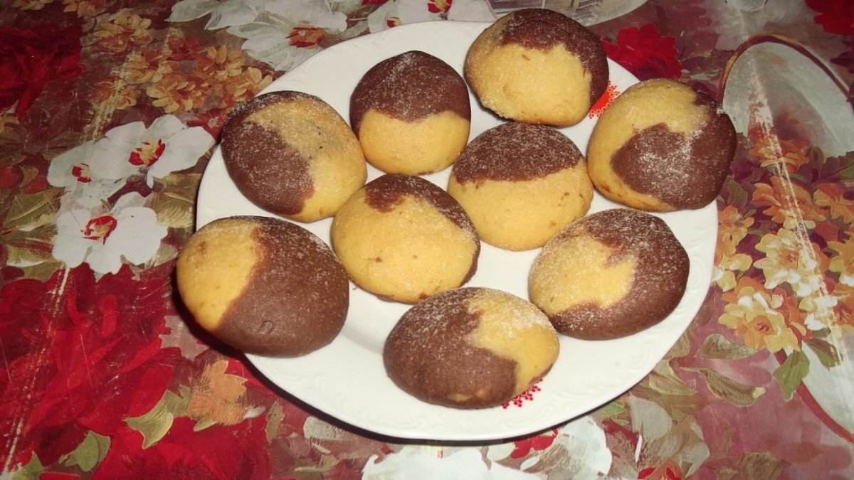 Se injumatatesc ingredientele si se fac doua aluaturi,unul cu cacao si celalalt fara. Amestecam ouale cu lingura de apa, la care adaugam zaharul, coaja de lamaie si mixam foarte bine. In timp ce mixerul merge adaugam uleiul si mixam. Adaugam (cacao) nuca de cocos, praful de copt si faina. Cu mainile unse cu putin ulei se ia din fiecare aluat cate o bucatica, se unesc si se fac bilute dupa marimea dorita. Sunt absolut delicioase si de fragede. Incercatile si nu o sa regretati. Pofta buna.