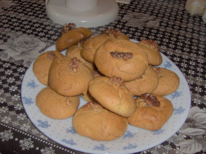 In oala mixerului se freaca oul cu zaharul si cu uleiul pana devine o crema spumoasa sau pana nu se mai simte zaharul. Se adauga restul ingredientelor si se amesteca bine pana obtinem un aluat compact putin lipicios. Punem o foaie de copt pe tava si cu mainile putin umede luam o gramajoara de aluat, ii dam o forma rotunda si o asezam pe tava, iar la sfarsit adaugam o bucatica de nuca sau migdala. Se coc la 180 de grade aproximativ 20 de minute sau pana se rumenesc usor. Sunt gustoase crocante. Spor la lucru.