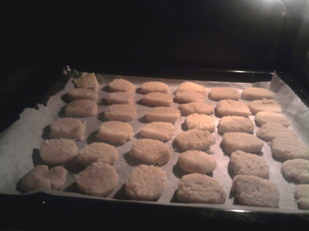 Frecem cilindrii prin zahar tos, taiem felii cam de 1 cm, dupa care ii introducem in cuptorul cald 180°C timp de 15 minute. Servim biscuitii cu zahar pudrat deasupra.