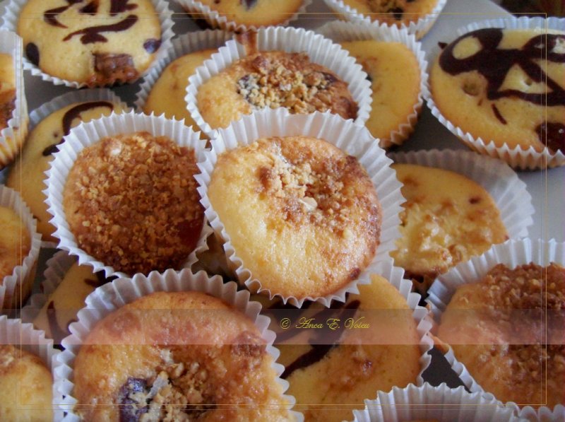 Se imparte compozitia in mai multe castronele, se adauga aromele preferate si se toarna in formele de copt, combinand dupa gust si inspiratie. Se decoreaza dupa plac.