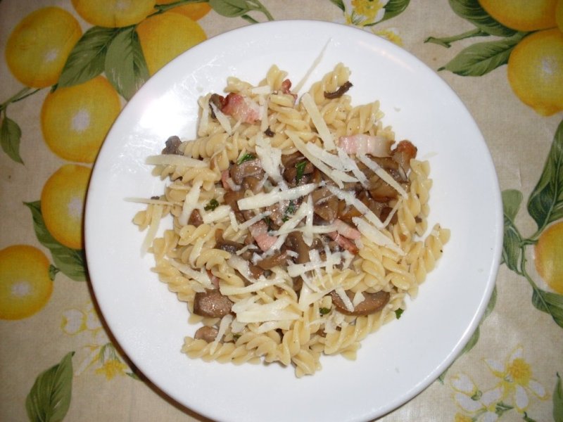 Se fierb pastele in apa clocotita cu sare. Intr-o cratita se pun la calit ciupercile cu un strop de ulei de masline, dupa care se adauga panceta pentru a se cali impreuna. Dupa ce pastele s-au fiert se adauga in cratita peste amestecul de ciuperci si pancetta si se calesc impreuna 2 minute. Se servesc fierbinti cu cascaval ras deasupra.