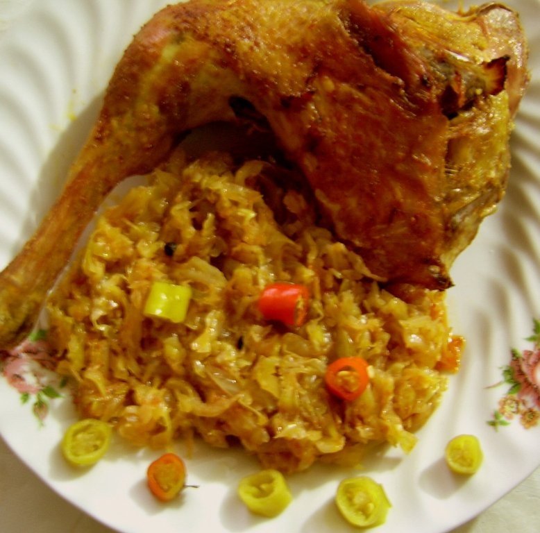 Scoatem gaina din supa in care a fiert si o condimentam cu sare, piper si o asezam cum putem mai bine deasupra oalei cu varza.