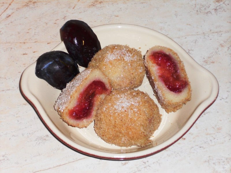 Se fierb cartofii in coaja,se curata si se dau pe razatoarea mica.Se amesteca cu faina si un varf de cutit de sare.Se framanta foarte bine si se intinde coca rezultata pe o planseta intr-o foaie de circa 1 cm.grosime si se taie in cercuri cu ajutorul unui pahar cu diametru de 8-10 cm.Prunele se spala si se curata de samburi,daca sunt prea mari se rup in doua,in prune se presara zahar si scortisoara apoi se aseaza pe fiecare cerc de coca si se formeaza bilute.In apa clocotita punem galustele si se lasa la fiert pana cand acestea se ridica la suprafata,le scoatem si le punem intr-o sita pentru a se scurge de apa.Intr-o cratita punem la calit pesmetul pana devine maroniu,oprim focul si il amestecam cu zaharul ramas.Se tavalesc galustele prin acest amestec de pesmet cu zahar.