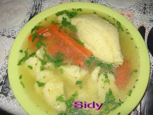 Adaugam grisul peste galbenusuri, astfel incit sa se faca o compozitie nu prea tare, totusi mai grosuta.Cind e gata compozitia, trebuie si supa sa fie in clocot si cu o lingura rupem galustele in supa.