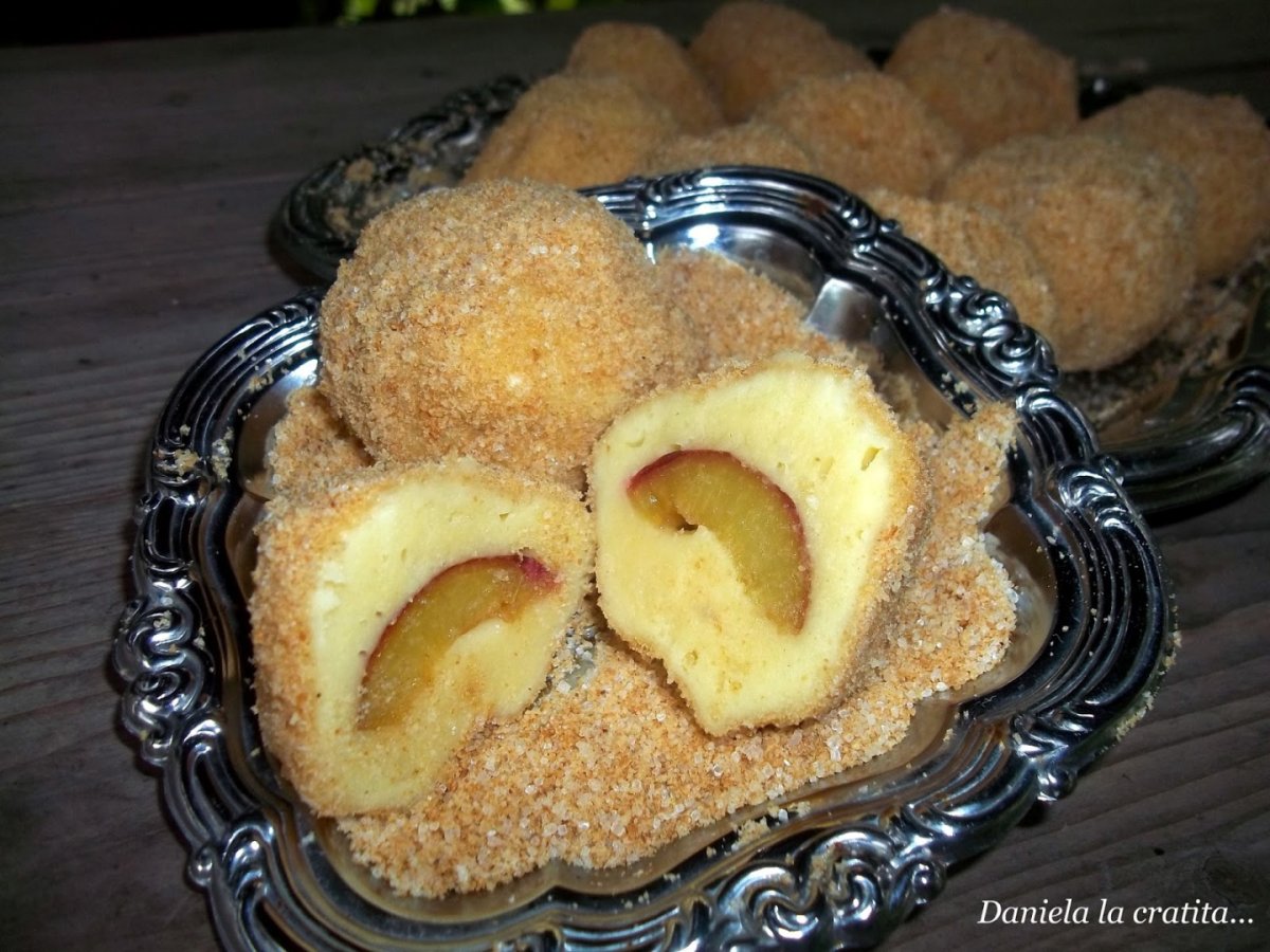 Din aluatul framantat se fac bile ca se pune in mijloc jumatati de pruna.Eu nu am pus pruna intreaga,deoarece ieseau niste gamboti foarte mari.Cu ajutorul unei palete se pun usor intr-un vas cu apa ce deja a inceput sa fiarba. Lasam sa fiarba la foc mic pana cand se ridica deasupra.Se scot cu grija cate una si se tavalesc prin amestecul de pesmet cu zahar.