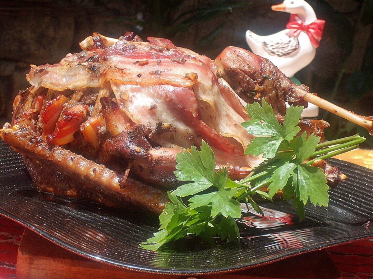 Se scoate tava din frigider, se impaneaza in fiecare crestatura de pe piept cu bucati de afumatura, se mai stropeste bobocul cu ulei de masline, se asaza din nou in tava cu pieptiulin jos apoi se acopera tava si se da o ora la cuptor, dupa care se intoarce bobocul cu pieptul in sus si se mai da jumatate de ora la cuptor.