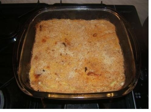 Spalati si fierbeti cartofii timp de 40 de minute in apa sarata, dupa care lasatii in apa rece pana cand reusisti sa dati jos pielita si facetii ca un piure, dupa care taiati in cubulete sunca, cascavalul si mozzarella si adugatile la compozitie impreuna cu ouale, dupa care anestecati tot. Intre timp pregatiti si tigaia, puteti folosi si un vas de iena, ungetil cu unt si pe deasupra puneti pesmetul, in acest mod compozitia nu se va prinde de peretii tigaii sau vasului de iena. pe deasupra puneti cele 6 lingurite rase de unt, parmezanul 30 grame si acoperiti totul cu pesmet. Coaceti la 180° pentru primul sfert de ora (15 minute) iar dupa asta la 200° pentru un alt sfert de ora. Lasati la racit timp de 10 - 15 minute si serviti