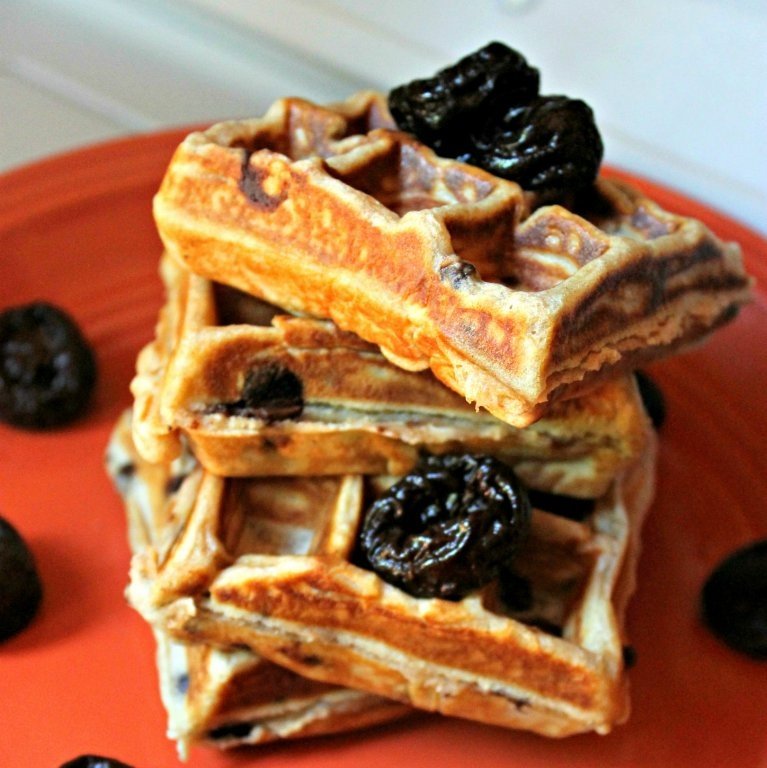 intr-un castron mare se amesteca faina, zaharul, praful de copt, sarea si prunele. Intr-un alta castron se amesteca ouale bine. Apoi se pune laptele, uleiul si esenta de vanilie. Se amesteca ingredientele umede si se adauga la uscat. Punem cate un polonic de aluat in aparatul special de vafe si coacem fiecare. Pune. niste syrup si POFTA BUNA!