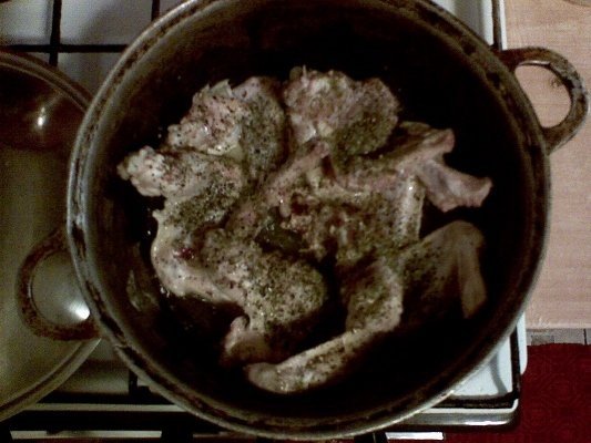 Carnea se prajeste in putin ulei si se condimenteaza (sare, piper, cimbru).