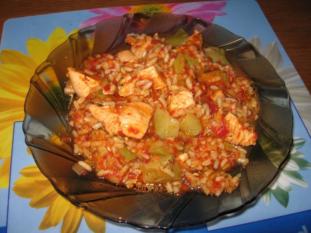 Ceapa taiata marunt se prajeste in ulei de masline, se adauga pieptul de pui taiat cubulete si se amesteca pina ce carnea isi schimba culoarea.Se adauga sare, piper, boia de ardei iute si o cana de apa.