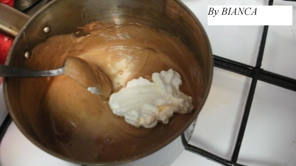 Cand s-a topit complet, dati deoparte vasul cu ciocolata, si incorporati cele 3 linguri de frisca/ smantana, amestecand pana cand se omogenizeaza.