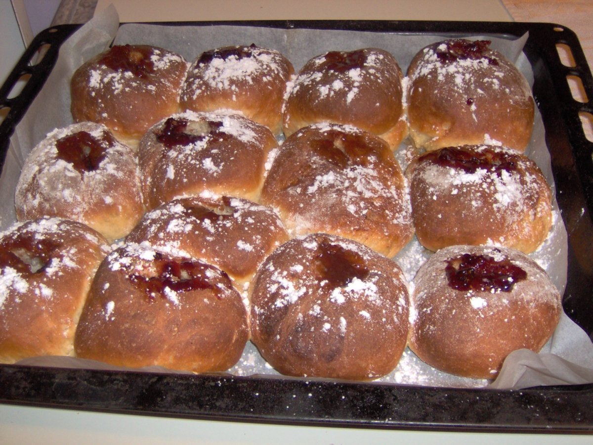 Il punem pe o plansa data cu faina si il impartim in 25 de mingiute si le rotunjim putin, le asezam pe tava tapetata cu hartie la distanta una de alta si le acoperim cu un prosop cam o ora pana dospeste din nou aluatul. Incalzim cuptorul la 180 de grade C si le coacem 15 minute sau pana s-au rumenit frumos. Le scoatem, le lasam putin sa se raceasca si cu o seringa injectam gemul moale in gogoasa si le presaram cu zahar pudra.