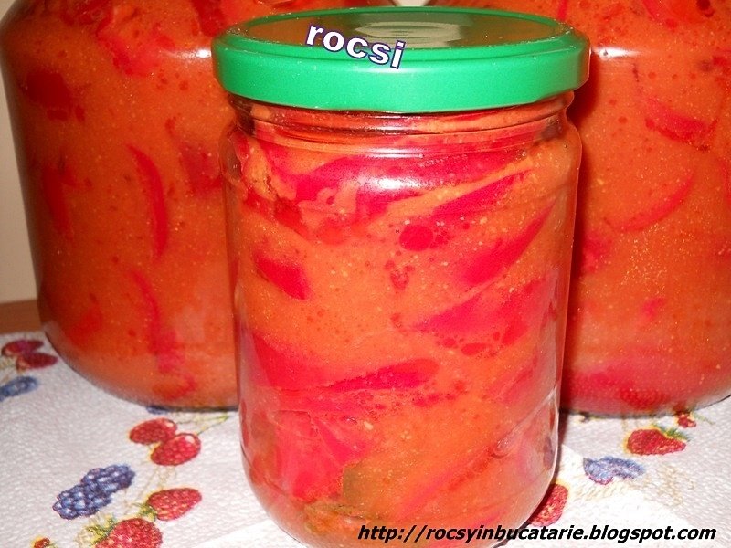 Cand sosul fierbe punem o mana sau doua de gogosari taiati, ii oparim circa 2 min apoi ii scoatem si punem alta tura de gogosari pana sunt gata toti.