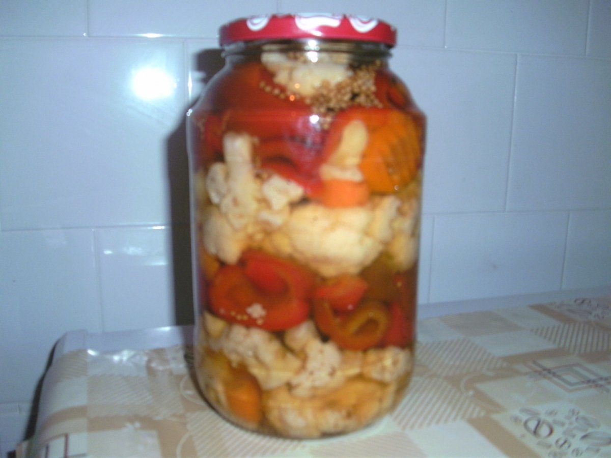 In borcanele spalate si uscate punem o frunza de telina, o radacina de hrean si un rand de gogosari, apoi un rand de conopida. Ii indesam bine cu mana si punem printre ei usturoi. Dupa aranjarea legumelor in borcan turnam baitul fierbinte deasupra.