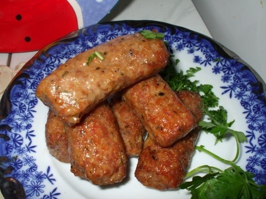 Din carne de pui tocata (sau pieptul si pulpele tocate) si condimentata cu usturoi tocat foarte fin (sau granulat), sare, piper, paprika, 1 lingurita bicarbonat de sodiu se formeaza mititeii cu mana uda sau unsa cu ulei.