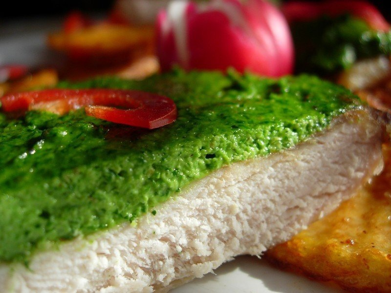Cand sant bine prajite, scoatem feliile de carne din tigaie, le asezonam si asa fierbinti le acoperim cu un strat de 2-3mm de pasta de leurda.