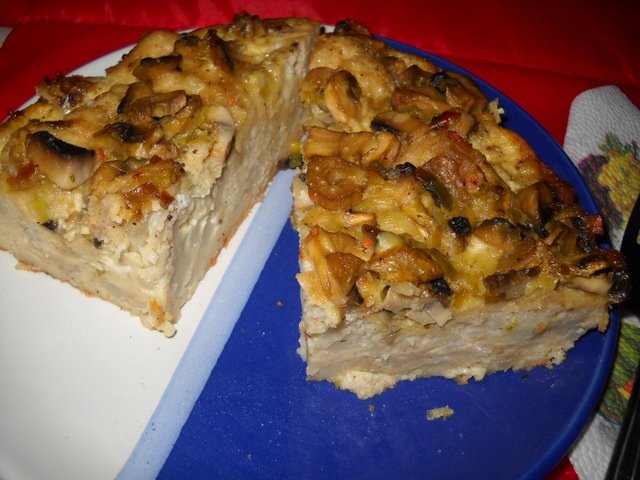 Buchetelele de conopida oparite 8 min in apa cu sare,le scoatem,le lasam sa se scurga. Apoi, trecem conopida prin ouale batute cu sare si piper,apoi prin pesmet,le asezam intr-un vas termorezistent. Separat, in alt vas cu ulei incins, calim ceapa tocata marunt,ciupercile feliate. Dupa ce a scazut apa din ele,condimentam si le rasturnam peste conopida. In castronelul cu ou ramas adaugam faina,smantana,omogenizam si rasturnam peste ciuperci;lasam vasul la cuptor 30-40min, iar dupa ce s-a racit servim.