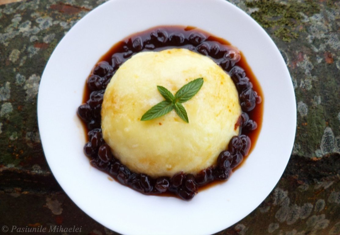 Il puteti servi cald, cu scortisoara, sau rece, dupa preferinta. Eu l-am pus intr-un castron, l-am lasat sa se raceasca putin, l-am rasturnat si am turnat niste dulceata de cirese amare primita in dar.