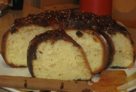 Facem testul scobitorii si cand este gata rumenit si facut scoatem din cuptor , lasam sa se raceasca si apoi rasturnam pe un platou.Se pudreaza cu zahar vanilat si se orneaza cu ciocolata topita si dulceata.Pentru ca nu am avut ciocolata am folosit topping de ciocolata.