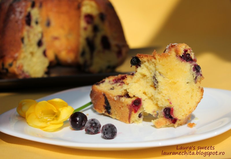 Afinele si coacazele le punem intr-un castronel cu o lingura de zahar pudar si le amestecam bine. Le adaugam in compozitie si cu ajutorul unei spatule, amestecam de cateva ori ca sa se distribuie uniform si turnam compozitia intr-o forma de guguluf. Eu am folosit o forma din silicon, astfel ca nu am mai uns cu unt si nici nu am folosit hartie de copt unsa. Punem la copt in cuptorul preincalzit, la foc mediu, aproximativ 50-60 minute, pana devine bine rumenit. Astfel de aluaturi cu unt necesita un timp de coacere mai lung decat un pandispan simplu din oua.
