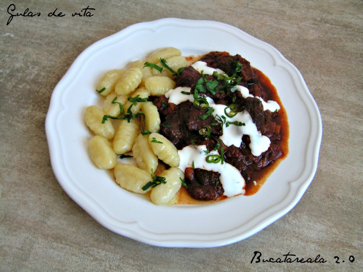 Asta e momentul in care pui si gnocchi la fiert. N-or fi gnocchi frati cu paprika, dar mi-au fost la indemana si am zis ca n-o fi foc daca-i gulasul putin fusion. Oala cu apa fierbinte se dovedeste a fi din nou utila. Proaspete, galustele astea din cartofi sunt gata in trei minute.